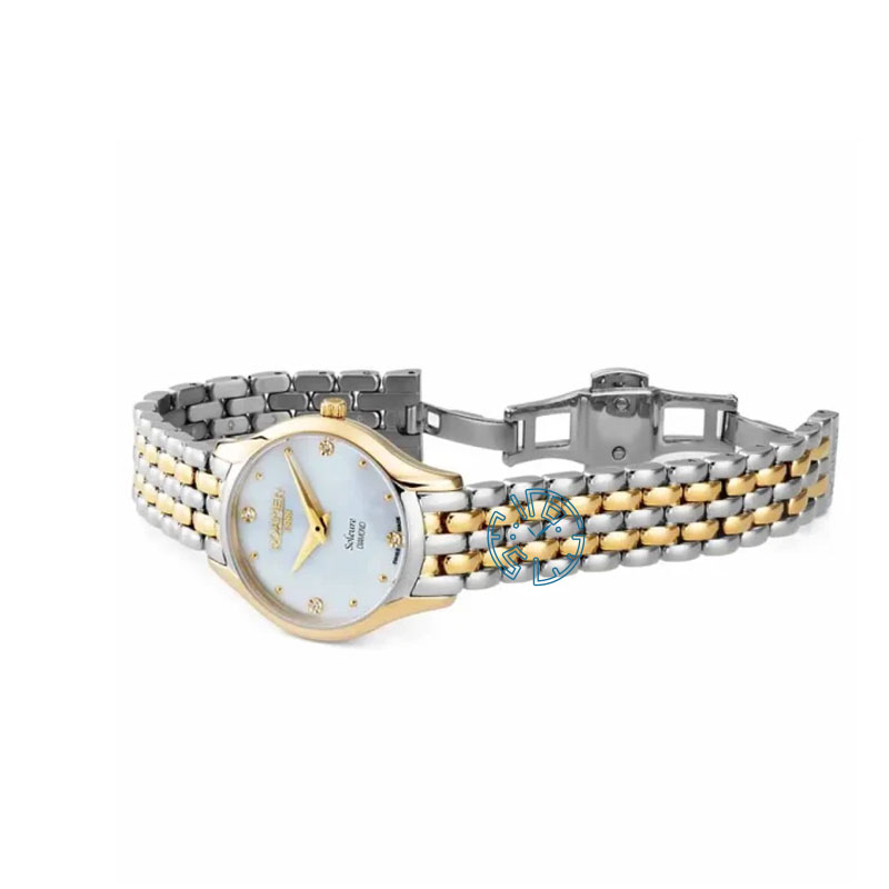 بدنه و بند استیل 316 با ترکیب طلایی و نقرهای، شخصیت این ساعت مچی را به سطحی بالاتر از مدلهای معمولی میبرد. این ترکیب رنگی با اکثر زیورآلات و استایلها هماهنگی دارد و آزادی انتخاب بیشتری به شما میدهد. قفل ضامندار نیز استفاده روزانه را آسانتر میکند و ساعت را با ثبات و امنیت روی مچ نگه میدارد. صفحه سفید با نشانگرهای ظریف و نگینهای چیدمانشده، زیبایی را بدون اغراق به نمایش میگذارد و در هر موقعیتی جلوهای متناسب و چشمنواز ارائه میکند.